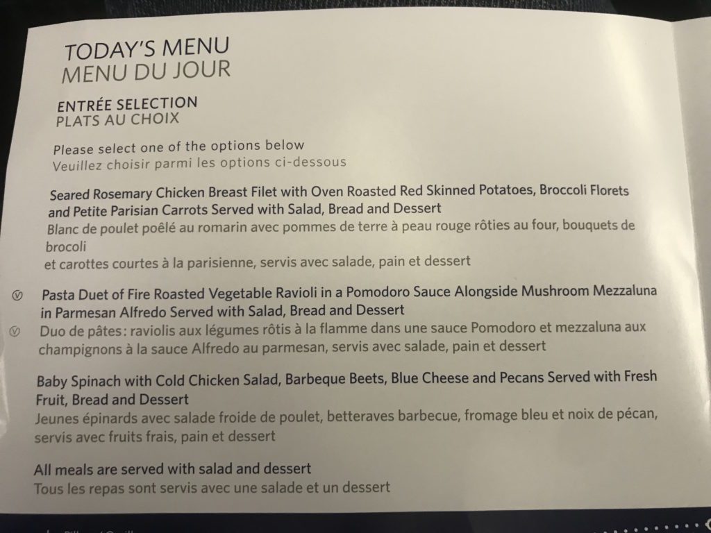 Meal service started about 90 minutes into the flight. A menu had been provided prior to takeoff. The main options were chicken and vegetables, pasta, or salad.