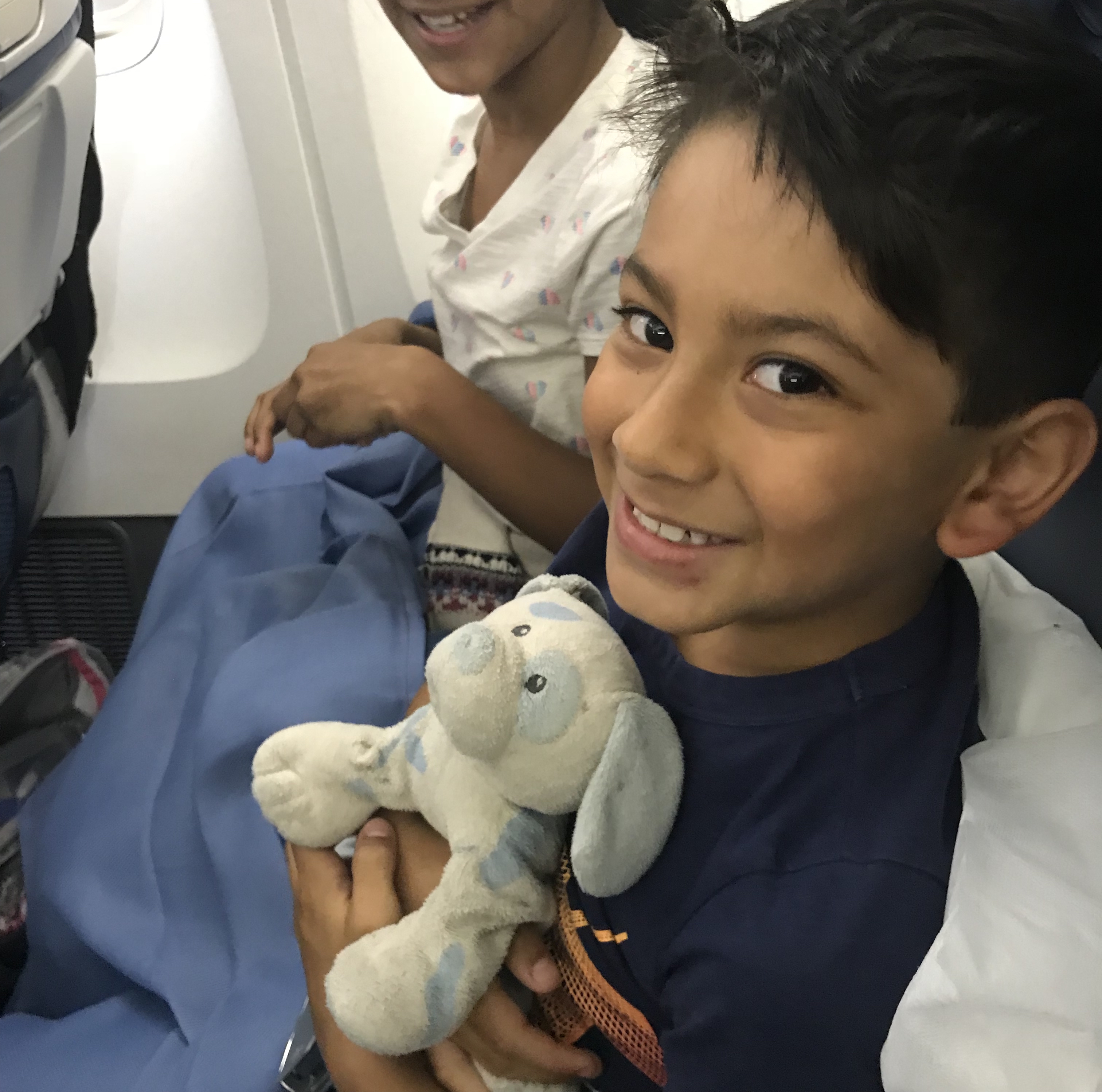 The kids were super excited. This was by far the biggest plane they have flown on (we flew on an A380 on our return, however). We don’t have a family travel mascot, but this kid takes his dog *everywhere*.