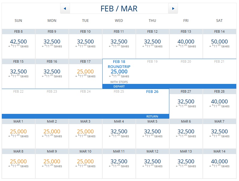 Instead of multiple days of availability, we only have 2 dates (Feb 23 and Mar 9). Again, this is based on an 8-day roundtrip cycle (so in order to show a 25,000 mile price BOTH the departure and the return must have saver availability. If I change it to a one-way search, I get much better availability