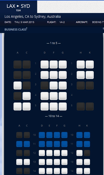 Once you pick your dates and then your flights, select View Seats. Here’s an example from Delta’s partner Virgin Australia’s LAX-SYD (one of the best redemptions for Delta miles, at 50,000 one-way in economy or 80,000 in Business)