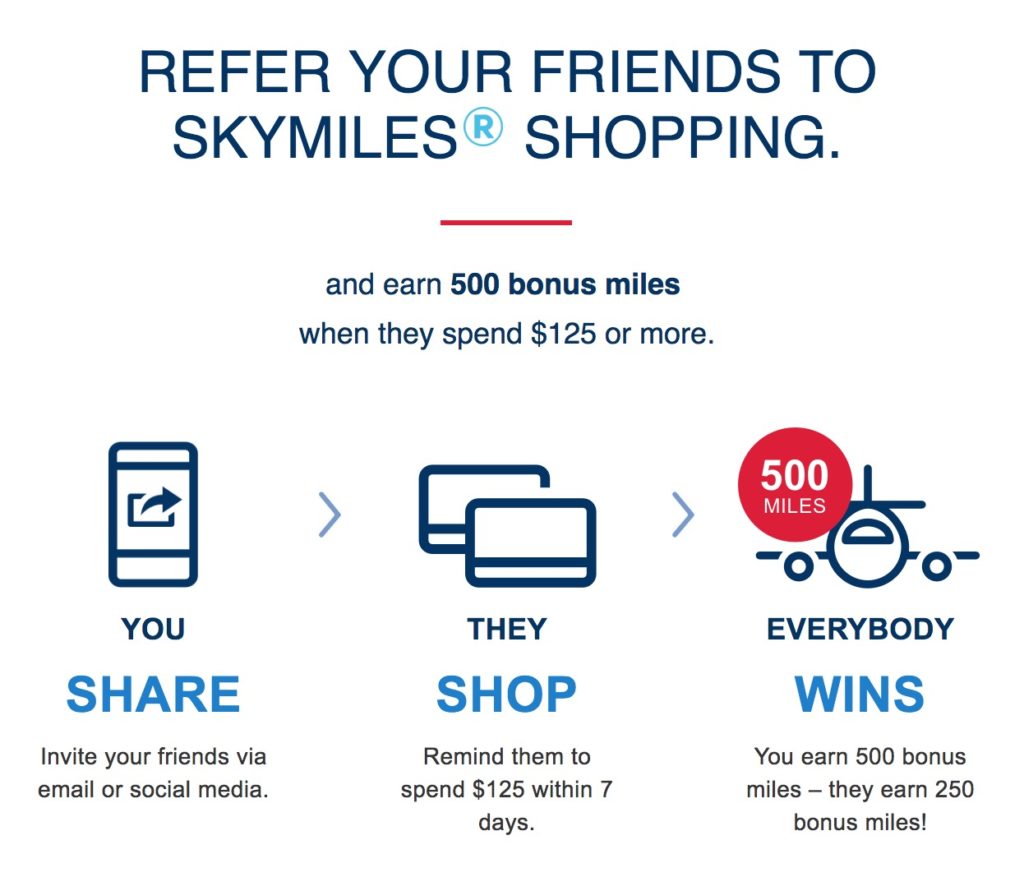 I got an email saying that the Delta shopping portal has an offer where you can refer your friends to Skymiles shopping. They have to spend $125 within 7 days. Then you (the referrer) will get 500 Skymiles and the person being referred gets 250 Skymiles. So essentially for the new person it’s like an extra 2 Skymiles / $1