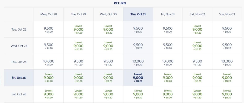 - Each route has a week-long window, with the earliest deal starting 10/24 and latest ending 4/22