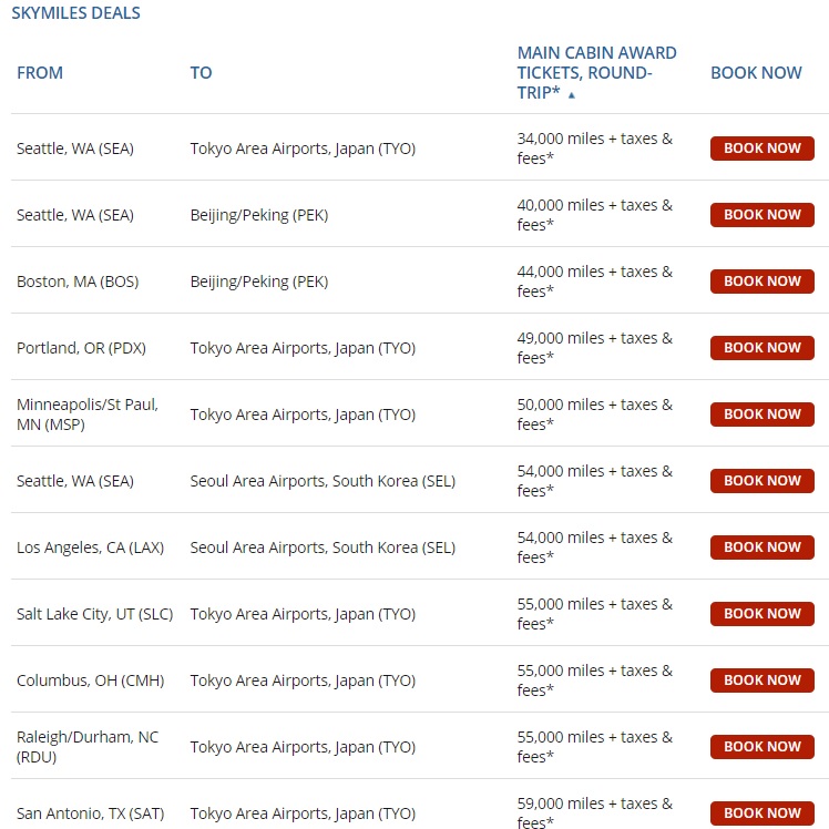 Other options aren’t as good, especially when the fees start adding up. That’s mainly due to the never-ending deals offered buy Chinese airlines keeping Asia prices low. 44,000 SkyMiles (& $41) Boston – Beijing isn’t really a deal if you can fly United for $576. This is closer to Delta’s strategy of “1 SkyMile = 1 cent”. While these might not be the most exciting offers, if a deal gets you where you want to go it can be a good deal.