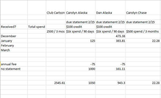 Ah well, this was definitely my fault so I let the minimum spend matter drop at this point. One thing I did was made sure to add an “annual fee” row to make sure to account for that. As you can see above, this nearly bit me a 2nd time on my Alaska Airlines card. I had “spent” $1,018.30 on the card (you get a $100 statement credit after spending $1,000 on the card), but that included a $75 annual fee that wouldn’t have counted. So I made sure to keep that card around and spend a few more bucks on it