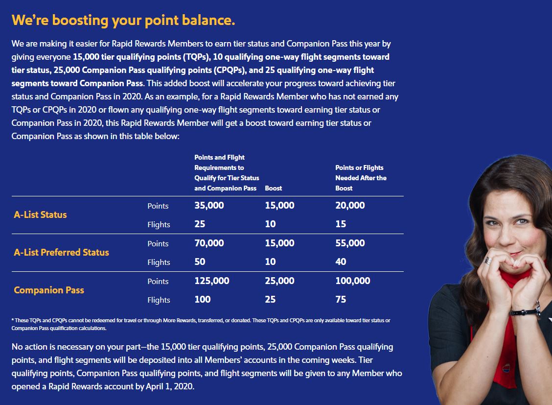 - All Rapid Rewards Members will receive a “boost” of 15,000 tier qualifying points and 10 flight credits toward A-List and A-List Preferred status, and 25,000 Companion Pass qualifying points and 25 flight credits toward Companion Pass status.