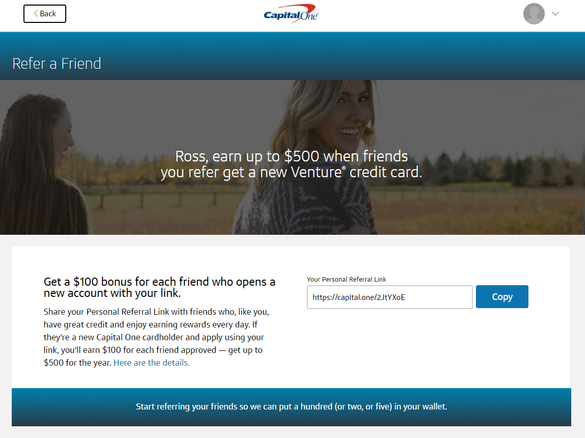 If you’ve been meaning to refer your friends and family to a Capital One card, check your email or follow the process above to see if you are eligible for the referral offer. You could earn $100 for every referral up to $500 in a calendar year. Remember to have your friend double check the bonus offered to them before applying.