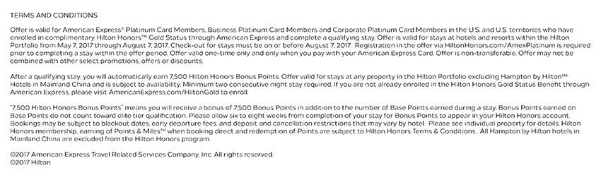 Below is the terms of the offer. It looks like it does require you to obtain the complimentary Hilton Gold status by holding the platinum card in order to take advantage of this offer. Qualify stays are from May 7, 2017 through August 7, 2017. This bonus is one-time only and you must pay for your stay using the Platinum card.