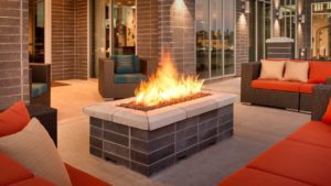 a fire pit with chairs in front of a building