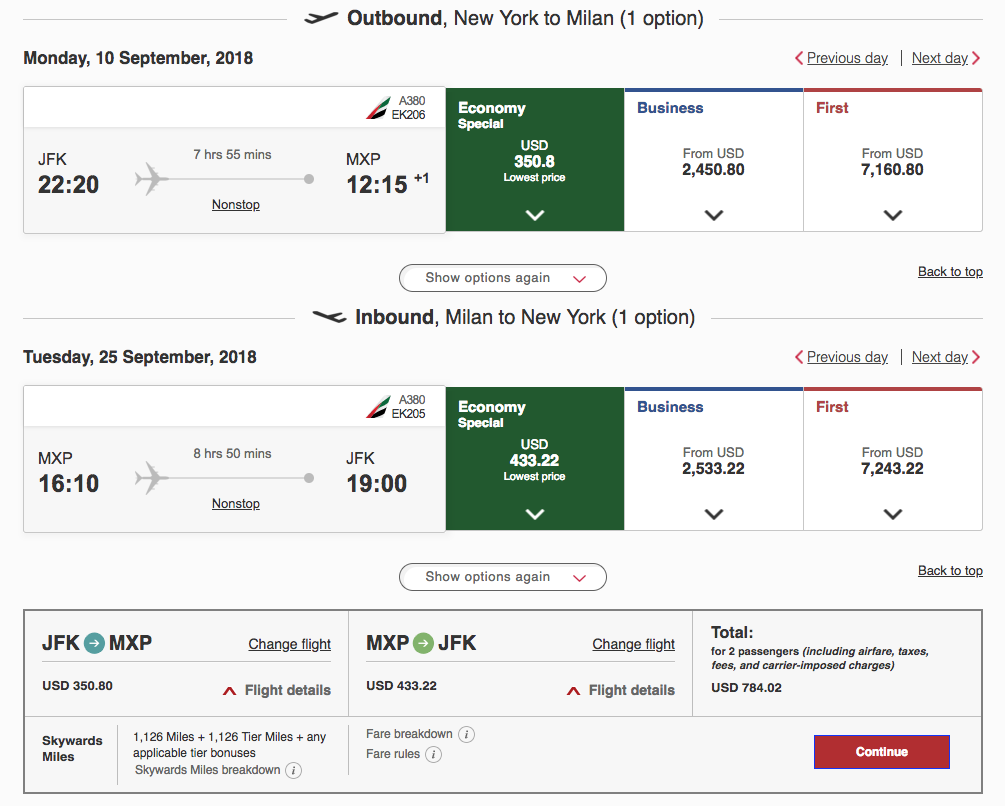 Here’s a sample from New York (JFK) to Milan (MXP), this one comes out to $392 per person. Imagine that…on Emirates!!!!