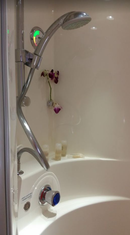 You can see the red / yellow / green water timer. Â While you have more or less an unlimited time in the shower suite (within reason, I’m sure), you only have 5 minutes of water on a Emirates A380 first class flight, which is counted down with the timer. Â You are able to start and stop the water as much as you want, which I ended up doing. At 4 minutes (so with 1 minute left), the water turns off to give you a “warning” that your water is about to run out. Â I actually had a bit of panic at that point, since I still had shampoo in my hair and was not nearly ready yet!