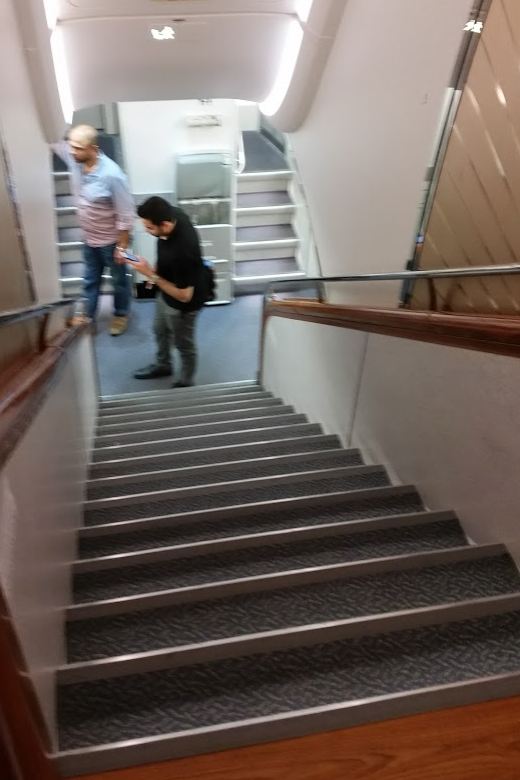 To the front of the first class cabin, there are stairs that go down to the lower level of the A380 plane