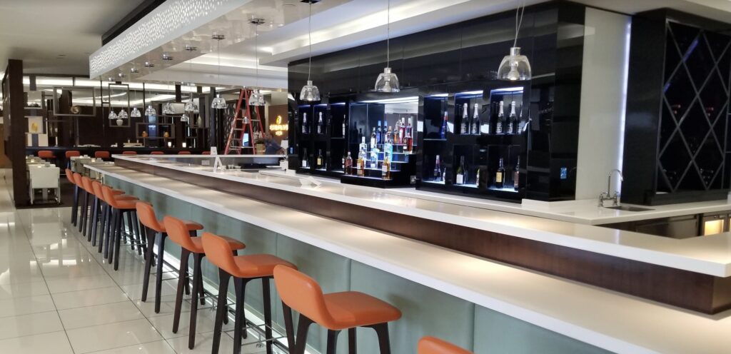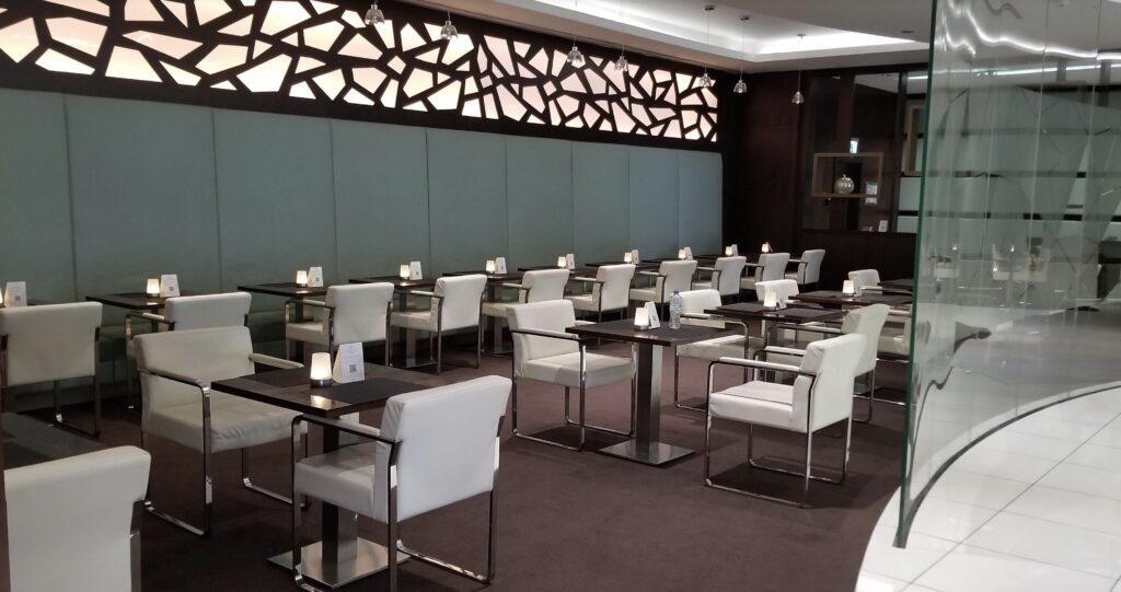 One thing that I found interesting was the relative lack of power outlets. A few seats had these boxes in the floor that only half looked like they were intended for customer’s use. The USB ports on two of the ones near us didn’t work, and only one of our international adapters fit into the box. Most of the seats we saw had no access to power outlets at all. That seems like a big miss for such a premium lounge.