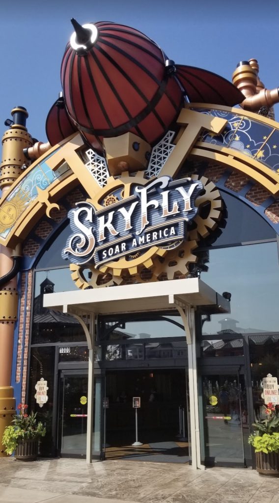 They also have a new ride called SkyFly Soar America which is a cross between a roller coaster and a movie. You sit in seats that move while watching a presentation on a movie screen. The theming is very steampunk (see picture below) and it takes you on a ride to famous sites around the world like Yellowstone, Maui, Alaska, etc. It was a cool ride for sure.
