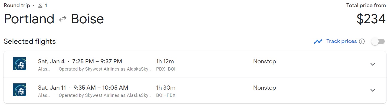 - Portland to Boise: $234 first class, $183 Boise ($323 w/bags)