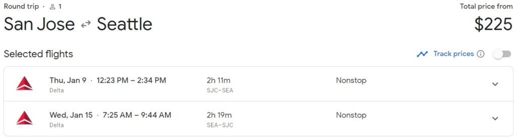 - San Jose to Seattle: $225 first class, $117 economy ($257 w/bags)