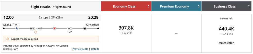 Another interesting tidbit was that when she searched for Osaka to Tokyo flights directly, nothing showed up in her system (or on Aeroplan’s website)