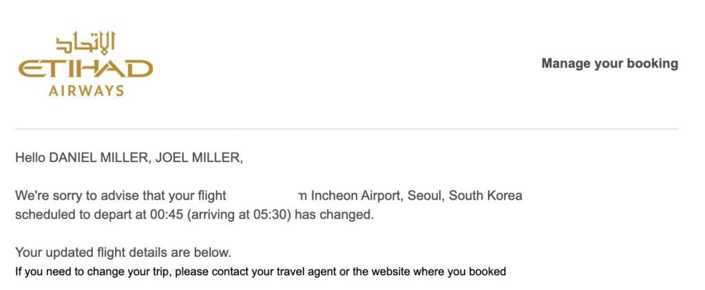 Since there are still a few months to go before the trip happens, I have gotten a few notifications of different flight changes. Most of them were not that big of a deal – moving the departure or arrival time by a few minutes either way. But then… I got a whopper of a schedule change. My flight from Osaka to Seoul was now scheduled to arrive at 6:30 p.m., one hour AFTER my Etihad flight from Seoul to Abu Dhabi was supposed to take off. This is not the first time I’ve had to overcome airlines making me time travel, but I knew it would require a call into Air Canada.