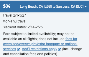 - Different or additional day of week restrictions, travel windows, and blackout dates may apply and vary by route. Click on a fare for details.