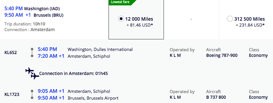 I found one-way flights from Washington D.C. to Brussels connecting through Amsterdam is just 12,000 miles plus $81.46 for taxes and fees. With the 30% transfer bonus from Citi ThankYou points, the flight would cost just 9,230 points plus the taxes and fees.
