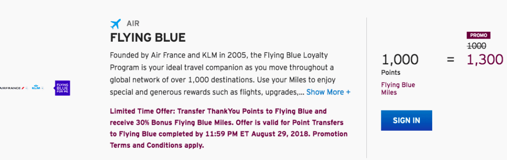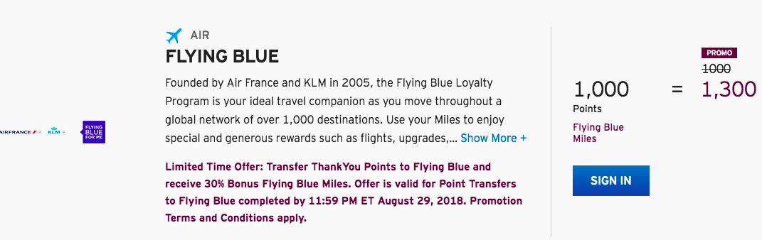 You can access the details of the transfer bonus here. ThankYou Points usually transfer to Flying Blue at 1:1 ratio. With this bonus promotion, each 1,000 ThankYou points will get you 1,300 Flying Blue miles. There is no limit to how many ThankYou Points you can transfer, nor there is limit to how frequent you can transfer. The bonus is hard coded into the system through August 28