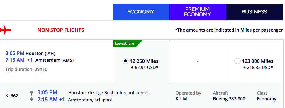 This means, you can fly to Europe for as low as 12,500 miles each way, or 25,000 miles round-trip per person, instead of the normal 50,000 miles. I found Houston to Amsterdam on KLM for 12,250 miles plus $67.94 for taxes and fees.