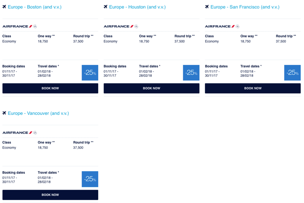 Flying Blue November 2017 Promo Awards are bookable online, valid for bookings made between November 1 and November 30, 2017, and travel between February 1, 2018 and February, 2018. (except for New York to Paris Orly through December 31, 2017). This month’s promo awards will get you 25% off coach awards to or from North America: