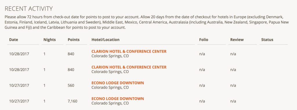 Then it was time to call in to the Choice Privileges service center. The first person I got was not helpful, but after HUCA, I got a friendlier agent who credited me my points (560 for the Econo Lodge stay and 840 for the Clarion stay).