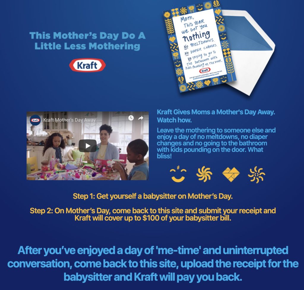 The fine print says that you hire a babysitter (can be either an actual service or a private individual; no news on what kind of vetting they will do to see if it’s a babysitter or a “babysitter”. Then submit it to https://www.kraftmothersdayaway.com/ starting on Sunday May 12th