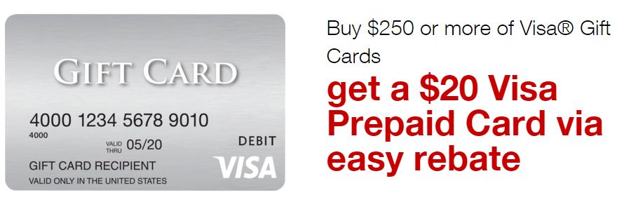To follow along, if you buy $250 in Visa gift cards this week at Staples, you’ll get a $20 Visa gift card by Easy Rebate in the mail. It’s in the weekly ad on page 9