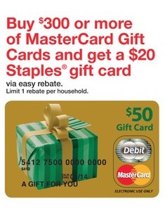 To follow along, if you buy $300 in Mastercard gift cards this week at Staples, you’ll get a $20 Staples gift card by Easy Rebate in the mail