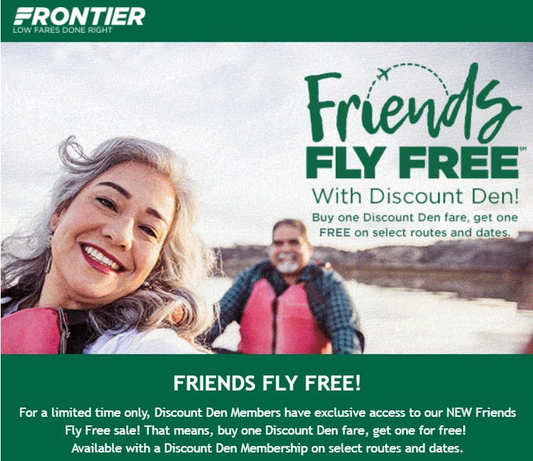 Frontier has launched the “Friends Fly Free” promotion, a “buy one, get one free” sale for member of its discount program, the “Discount Den.” With the code FLYFREE members get a free matching ticket for select flights any day of the week except Friday and Sunday during the sale travel window. Membership in the program isn’t free; it’s a subscription model for $59.99. However, members get access to the “Kids Fly Free” promotion as well, which provides a free ticket for kids 14 and under with each adult ticket purchase. Plus, Discount Den Savings ($1 – $10/flight) can be used on up to 6 passengers per itinerary, which is great for family travel. But even if you aren’t already a member, you can join online any time; that makes this promotion like getting companion passes for as many flights as you can book before the sale ends, for a single $69 purchase.