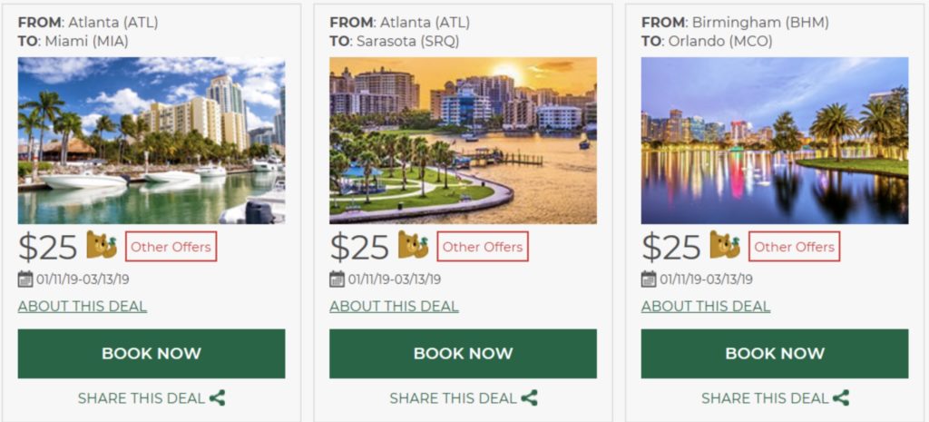 advertises flights from $29 through 3/6/19, I found cheaper flights from $20 through 3/13. Destinations include Tampa and Sarasota on the Gulf Coast, Orlando’s theme parks, Miami beach, and more. Return flights are on sale too, meaning a round trip with just a personal item is as low as $40. Remember: carry-on bag, seat selection, and other fees will apply.