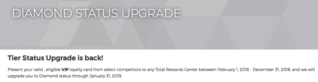 To receive the status match, you must visit the Total Rewards desk at one of the casinos and present your VIP membership card from a competitor. Participants that had their Total Rewards accounts upgraded via the 2017 Diamond Tier Match Offer will not qualify for this offer.