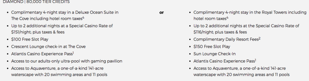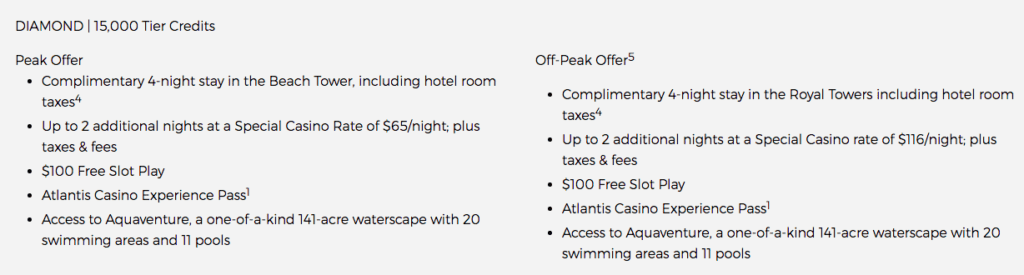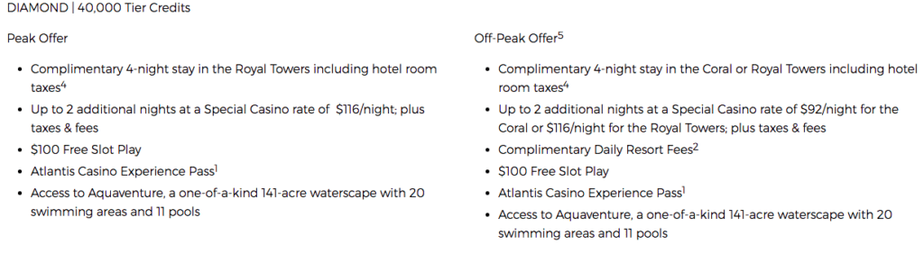 The 4-night free package you can book at Atlantis varies depending on the tier credit level of your Total Reward Diamond status. It will be interesting to find out what level of Diamond tier credit you get from this status match. The Atlantis package includes four free nights in a nicer room during off-peak season than during peak season, with additional two nights at deeply discounted nightly rates.
