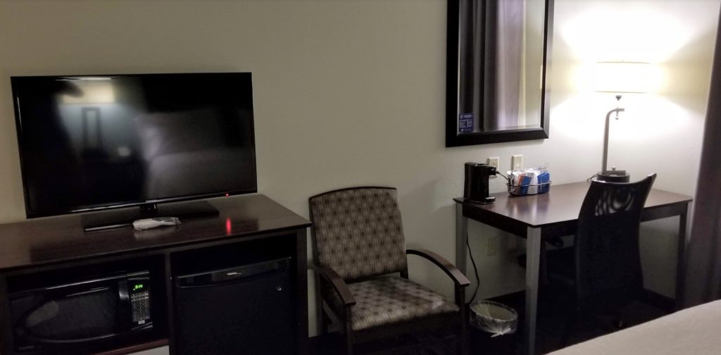 There was a small desk and chair on the other side of the room with a TV. There were plenty of outlets both on the desk as well as on the nightstand near the beds, which is always appreciated.