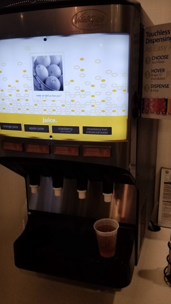 The drink machine was a touchless dispenser, though I wished they would have normal water instead of “strawberry kiwi enhanced water.”