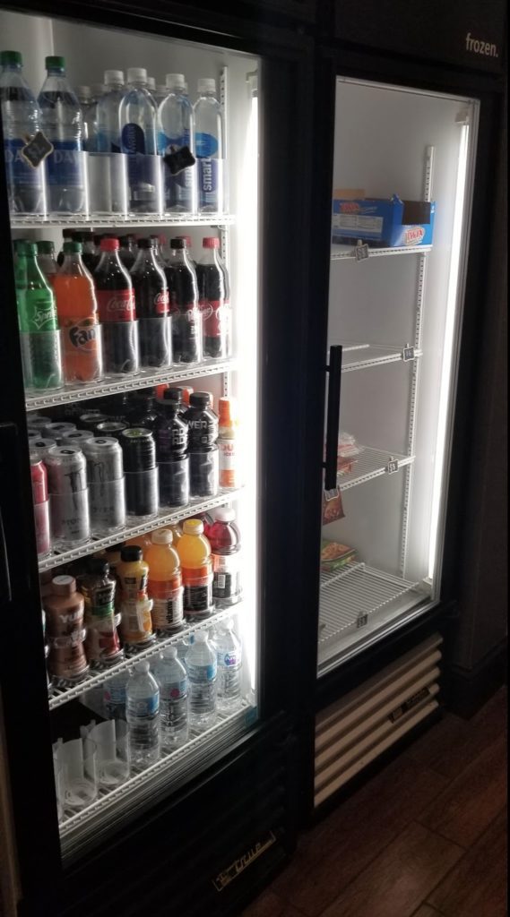 Water bottles on the bottom shelf were complimentary for all members, while the other drinks and water on the top shelf cost money.