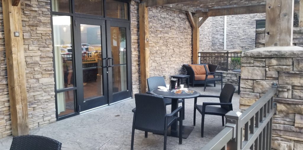 There are also a few tables outside just adjacent to the breakfast area. I imagine these fill up quickly on nicer days, but we were able to snag a table and eat out here. The night before there was also a fire going out here with people hanging out on the covered patio.