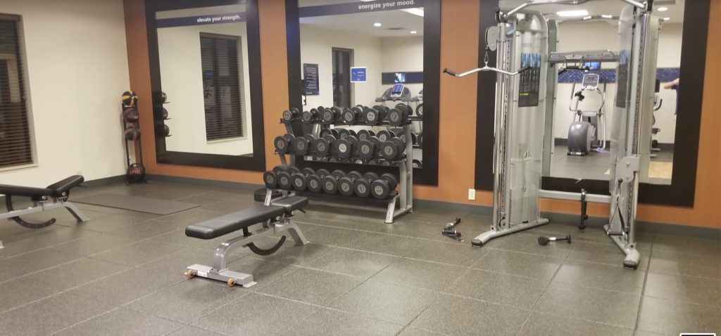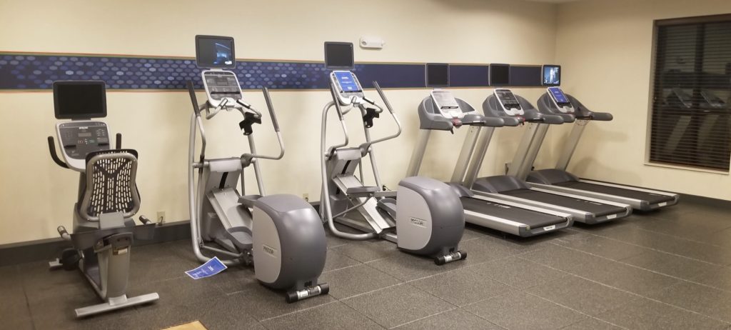 The fitness center was on the large side for a Hampton Inn, with a row of cardio equipment: