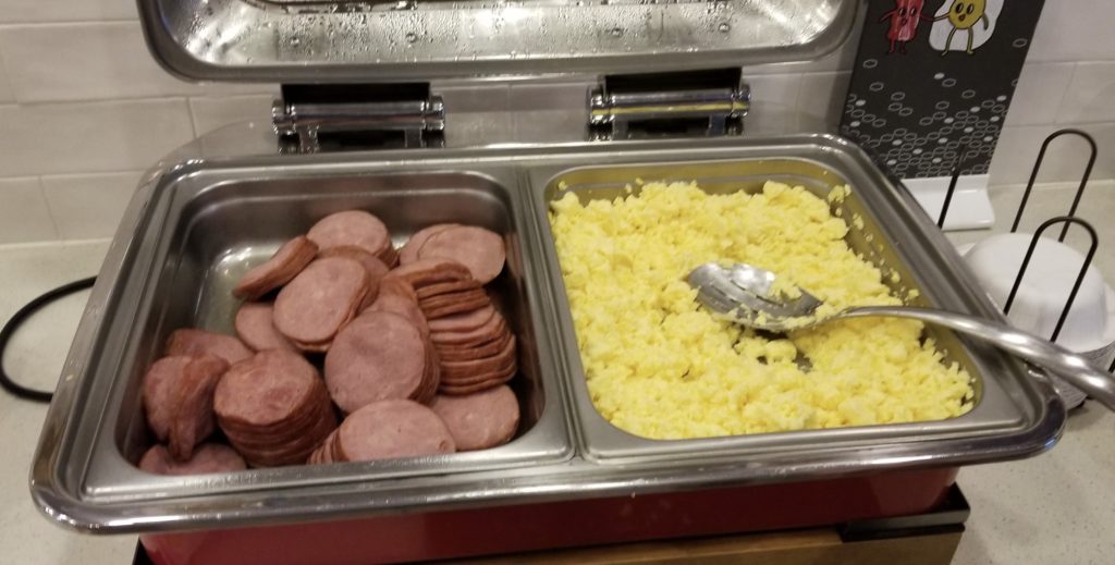 The Hampton Inn Lookout Mountain has a complimentary breakfast, and they are serving one hot item – eggs and a rotating meat dish. On the day I attended it was ham slices. When I called about COVID hotel breakfast a week or so beforehand, they said they had just started full breakfast on May 1, though the front desk employee at the hotel said it had been going on a few months previously.