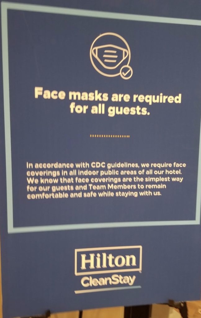 I visited the Hampton Inn Chattanooga West / Lookout Mountain in May 2021, just as COVID-19 precautions were beginning to loosen in many areas of the country. Although it was a few weeks after the CDC announced that fully vaccinated people no longer needed to wear masks, the hotel was still requiring masks. And by “requiring” I mean, putting this sign up. When we arrived on Thursday night, we saw literally nobody other than the hotel front desk employee wearing a mask.