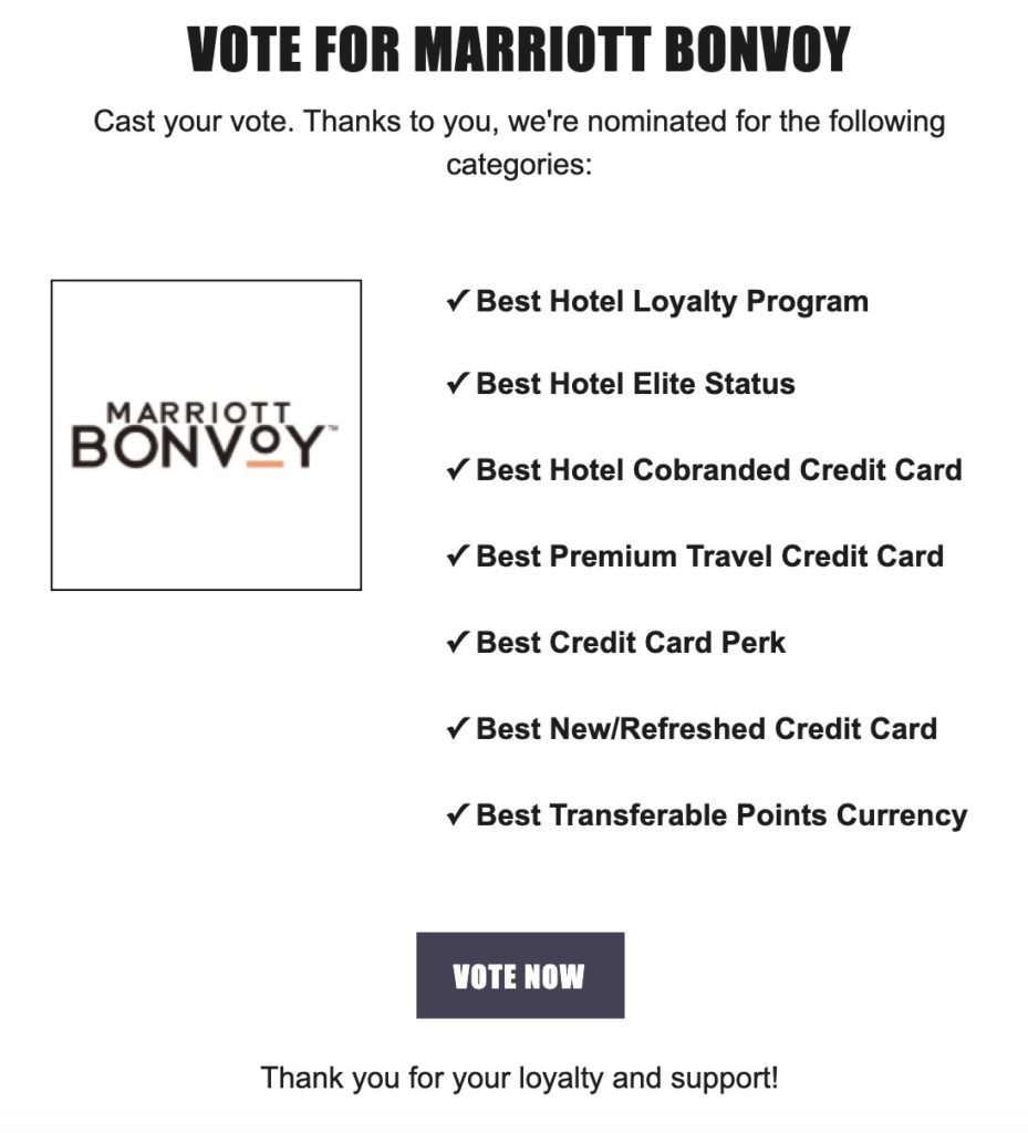 I got an email from Marriott Bonvoy encouraging me to vote for them in the TPG Readers’ Choice Awards, which apparently is a thing. After I got off the floor from laughing at the fact that I would be voting for Marriott Bonvoy in anything other than the “Worst Hotel Loyalty Program” or “Worst Merger Integration”, I thought I’d take a vote.