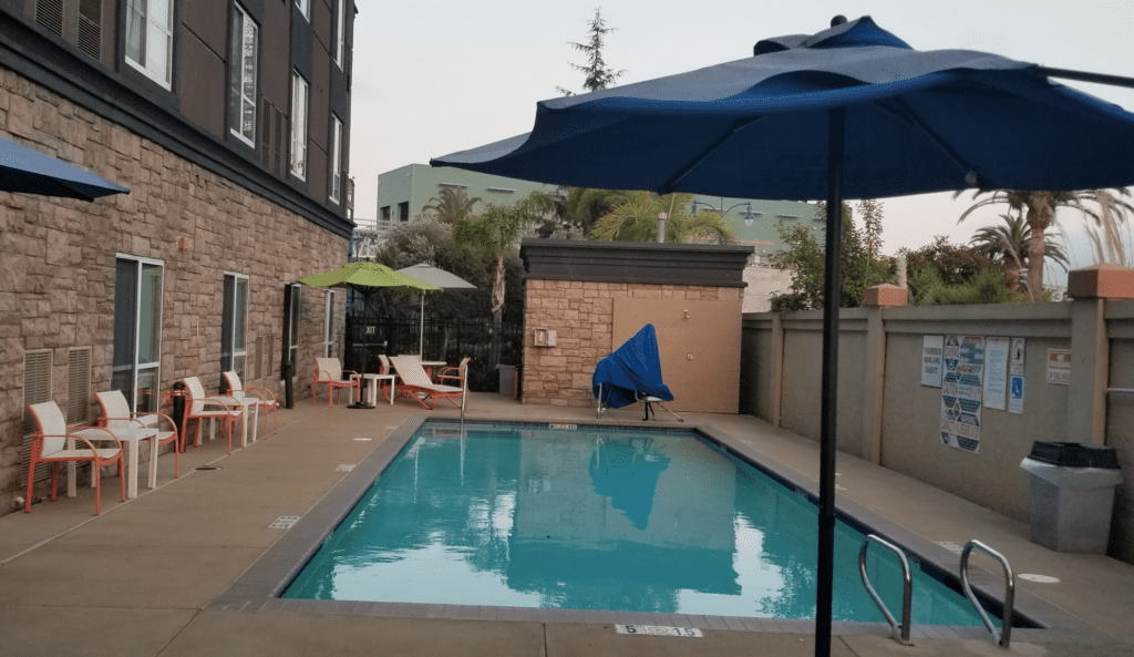 There is a Holiday Inn and Suites – Oakland Airport outdoor pool, which is open until 10pm