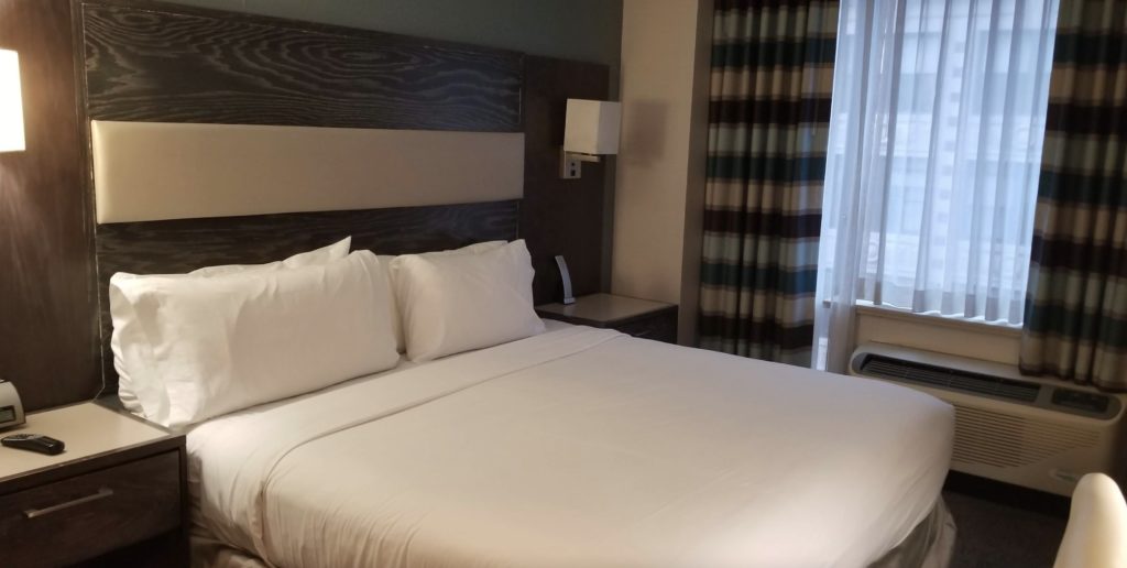I booked a 1 King bed room at the Holiday Inn Express Times Square South even though I was staying with my daughter. I think there was only the option to get “random room” when I booked. And then when I checked in, I forgot to ask about getting 2 beds. The bed was okay but shorter than a normal king bed – I’m about 6′ tall and unless I was right u against the headboard my feet slightly hung off the end. The pillows were flat like most hotel pillows.