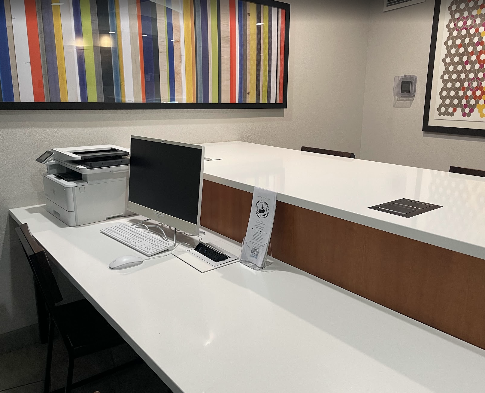 a white desk with a computer and printer
