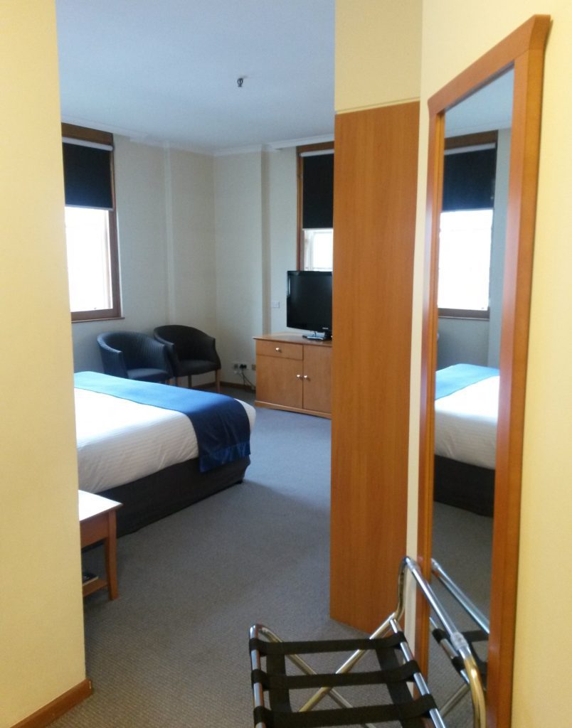 Room 620 is a fairly large corner with a view of the CBD, but unfortunately not of the harbour. There was a small entryway that opened into the room, with a door to the bathroom on the left.