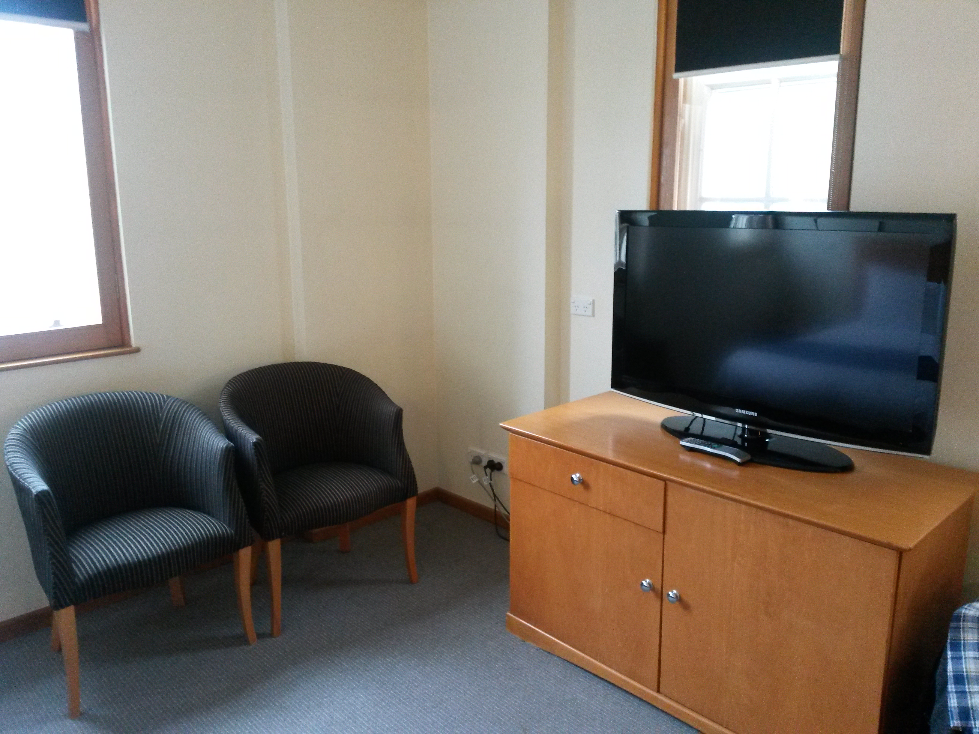There were a couple chairs in the corner. It seemed odd to me that there wasn’t a floor lamp and/or small table in the room. I did make a note of this and mention it to the front desk. It would help the room seem a bit less spartan.