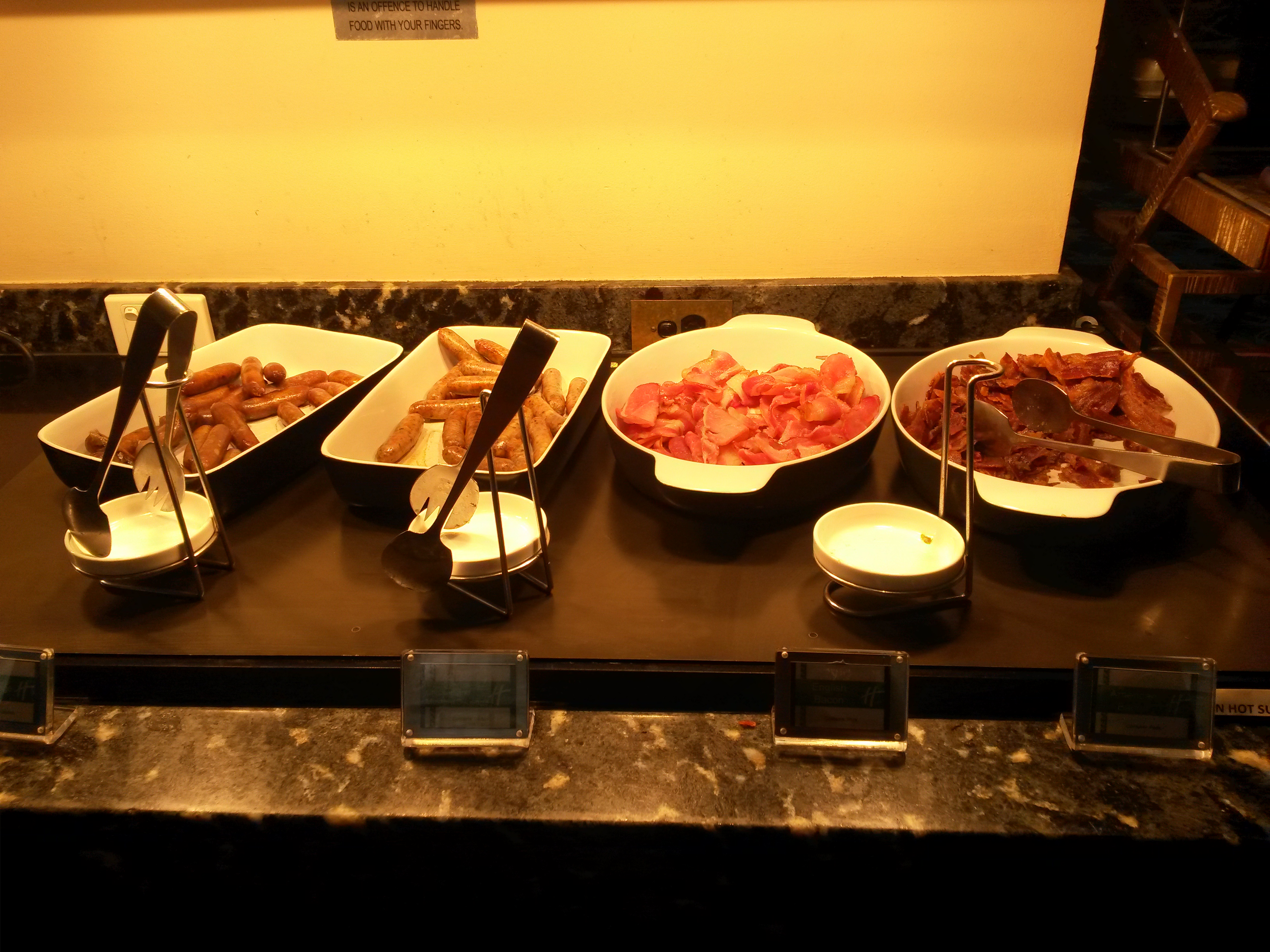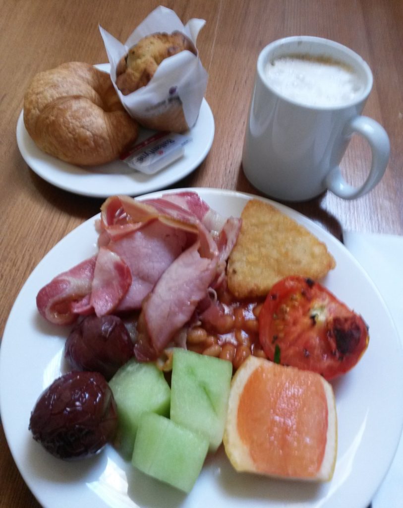 The offerings included fruit, yogurt, cereal, muffins, and pastries, as well as hot options including eggs, sausage, bacon and a few other offerings. Overall, it was a pretty good spread. You can’t read the signs in the photo, but they had both “American bacon” and “English bacon”. Sorry friends, the Brits outdo us on this one. I can’t do crispy bacon.