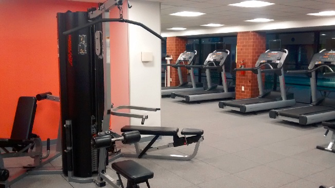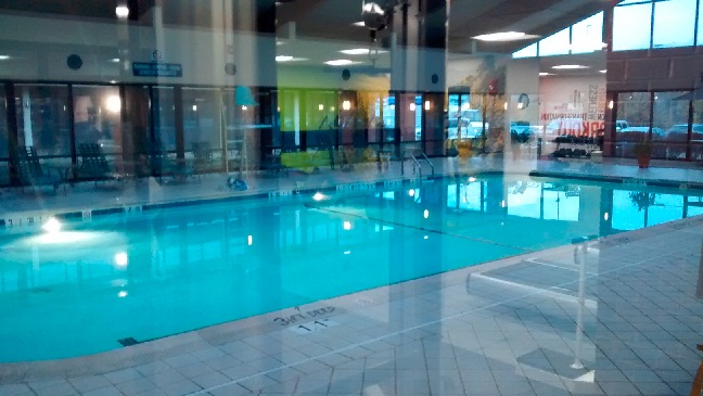 It has a full-size pool (though the door I was trying to go through was locked, which is why I had to take it through the window). Also the exercise room had several different kinds of weight machines in addition to treadmills, bikes, and other cardio machines.
