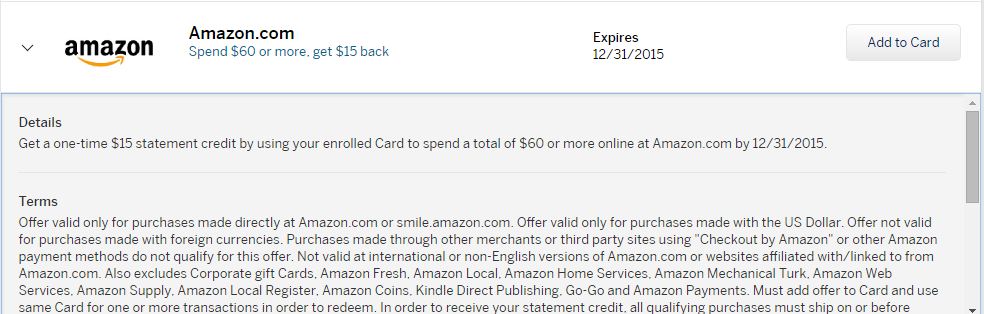 I have written before about Amex Offers, but there is a great one going on right now for a limited time – $15 off $60 purchase at Amazon.com